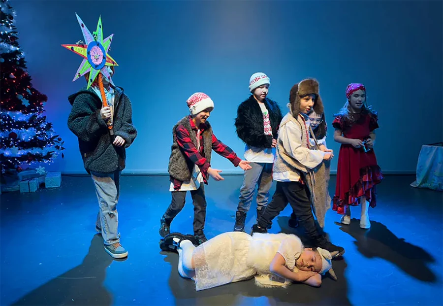 Калядны выступ навучэнцаў тэатральнай групы «Купалінка». Варшава, сьнежань 2025 г. Фота аўтара