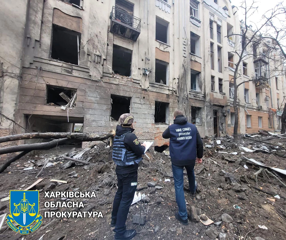 Харьковская прокуратура опубликовала фото последствий ракетного обстрела. По данным ведомства, частично пострадало здание университета имени Бекетова, при этом был ранен охранник.